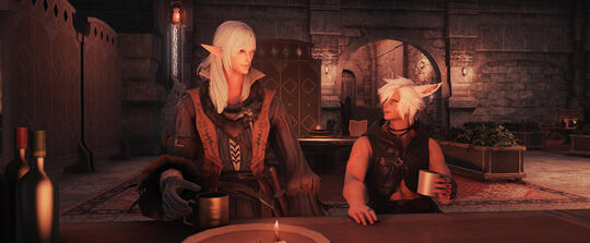 Later that night on the balcony of Mor Dhona, Thancred and X’enik have a deep discussion. Thancred sheds tears over his separation from Ryne, and X’enik comforts him, to which Thancred finally decides to confront X’enik about his feelings and confesses. Admittedly, Thancred isn’t used to confessing genuine, serious feelings and stumbles a few times, X’enik teasing him for such, but he is undoubtedly overjoyed and shocked that Thancred has finally reciprocated his feelings.